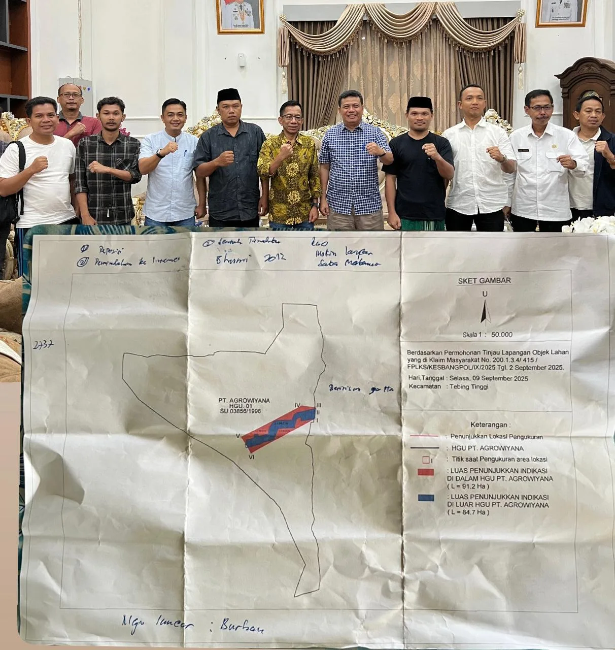 Tanjung Jabung Barat – Pemerintah Kabupaten Tanjung Jabung Barat melalui Badan Kesatuan Bangsa dan Politik (Kesbangpol) menggelar rapat koordinasi bersama Kantor ATR/BPN Tanjung Jabung Barat dan sejumlah pihak terkait, Rabu malam (15/10/2025), di Rumah Dinas Wakil Bupati Tanjung Jabung Barat. Rapat tersebut membahas hasil pemetaan lapangan oleh ATR/BPN terkait konflik lahan antara kelompok tani penggarap Desa Purwodadi dengan PT. Agrowiyana di Kecamatan Tebing Tinggi.